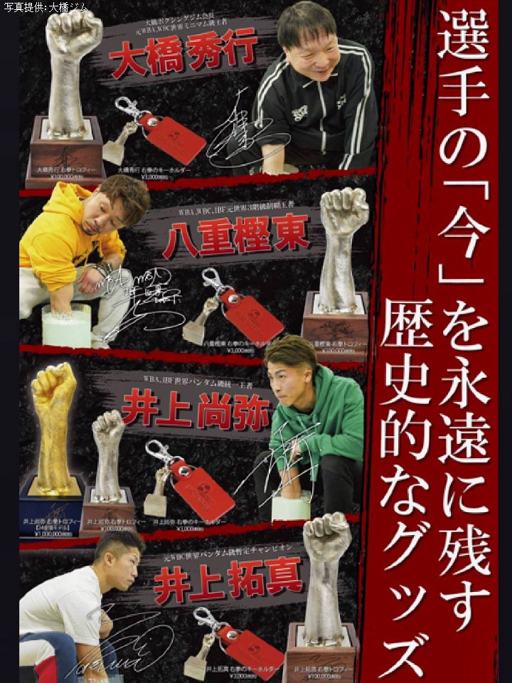 大橋ボクシングジムは12日、WBA(世界ボクシング協会)バンタム級スーパー王者、IBF(国際ボクシング連盟)同級王者の井上尚弥(27)、元世界3階級制覇王者の八重樫東(37)、WBC(世界ボクシング評議会)バンタム級暫定王者の井上拓真(24)そして元WBA・WBC世界ミニマム級王者の大橋秀行会長(55)の実寸大右拳トロフィー、右拳キーホルダーを発売することを発表した。