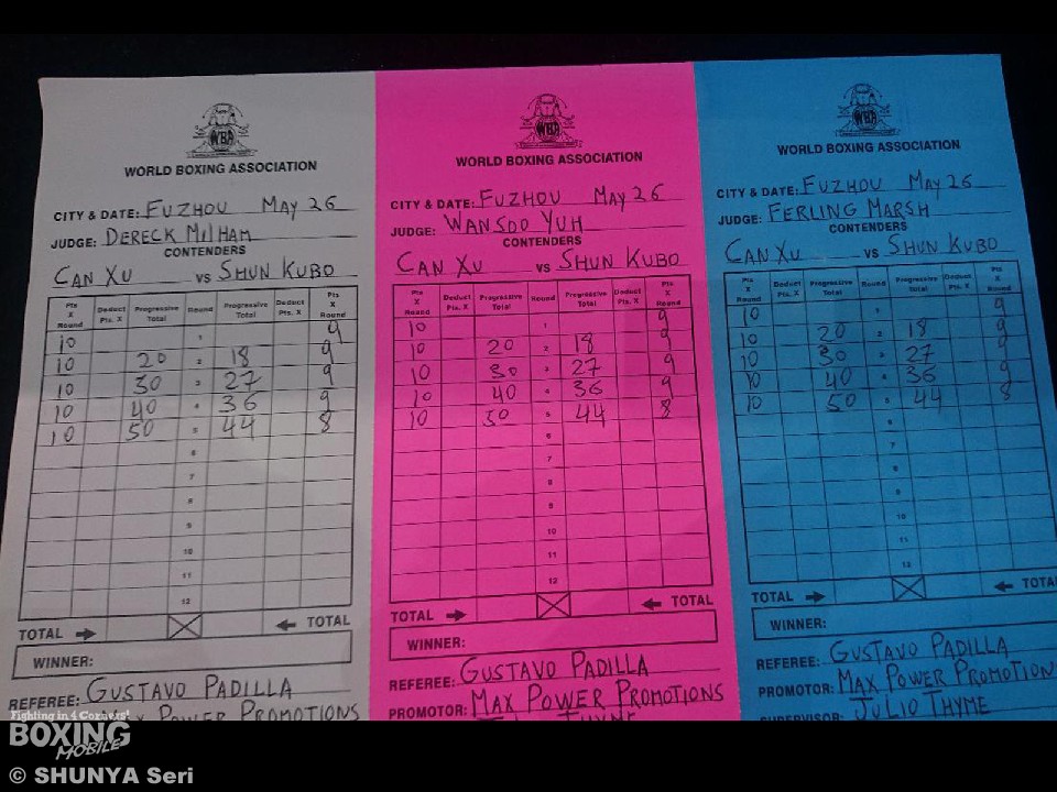 久保は左ストレートを突き刺しながら執拗に左ボディを攻めるが、凱旋防衛戦のシューは5回に右ストレートで久保の顔を跳ね上げると終盤に左フックでダウンを奪った。ここはゴングに救われた久保だが、続く6回も手数で上回られレフェリーストップ。シューが6回1分42秒のTKO勝ちで初防衛に成功し、久保の2階級制覇は叶わなかった。戦績はシューが19戦17勝(3KO)2敗。久保は15戦13勝(9KO)2敗。