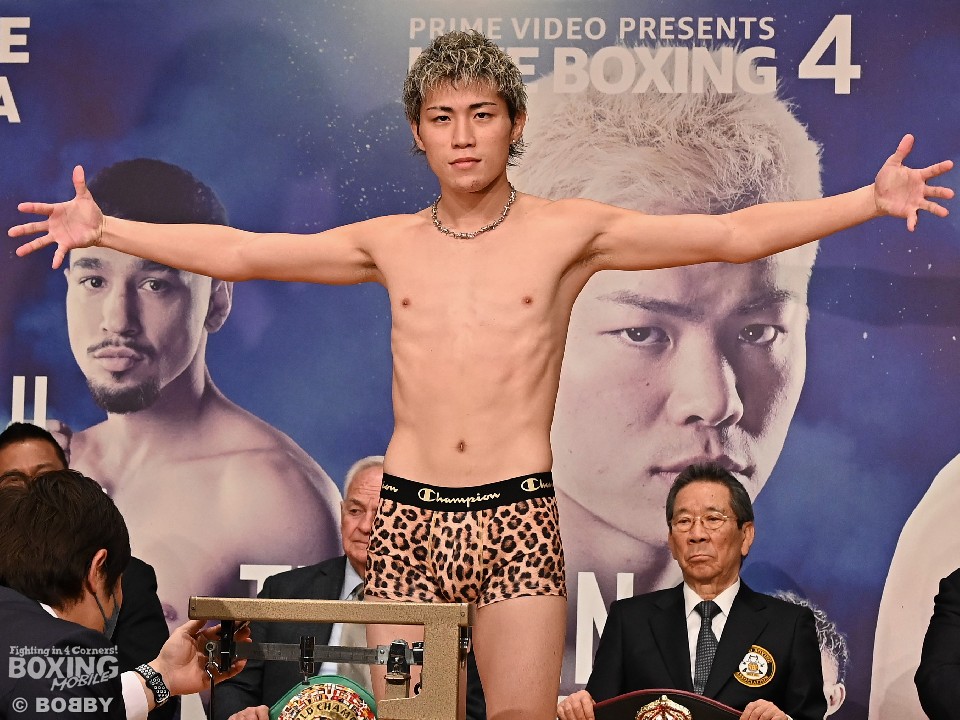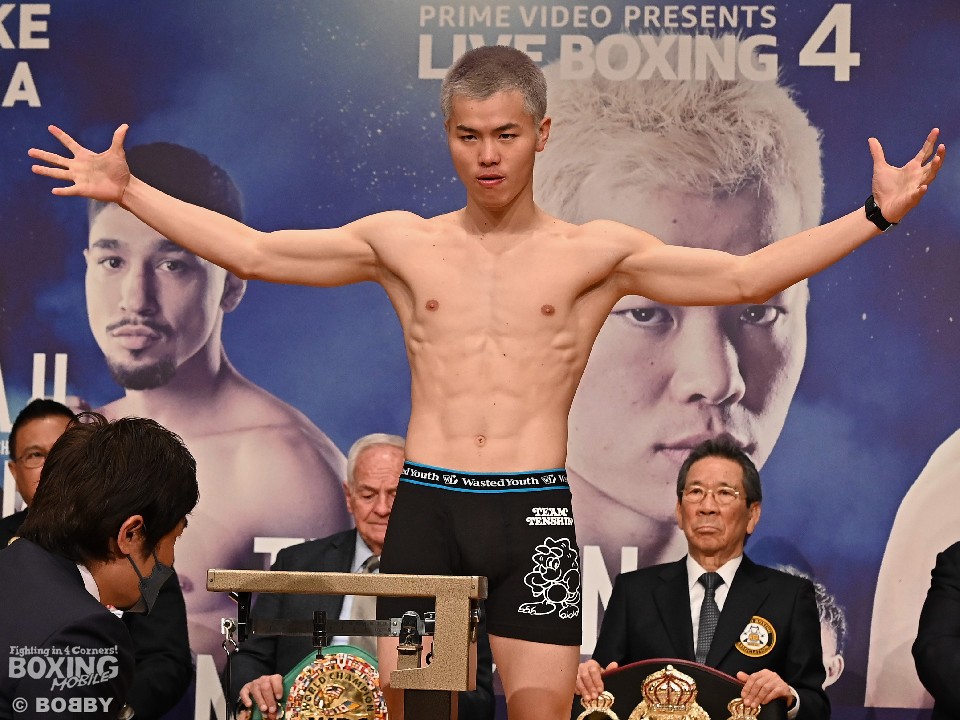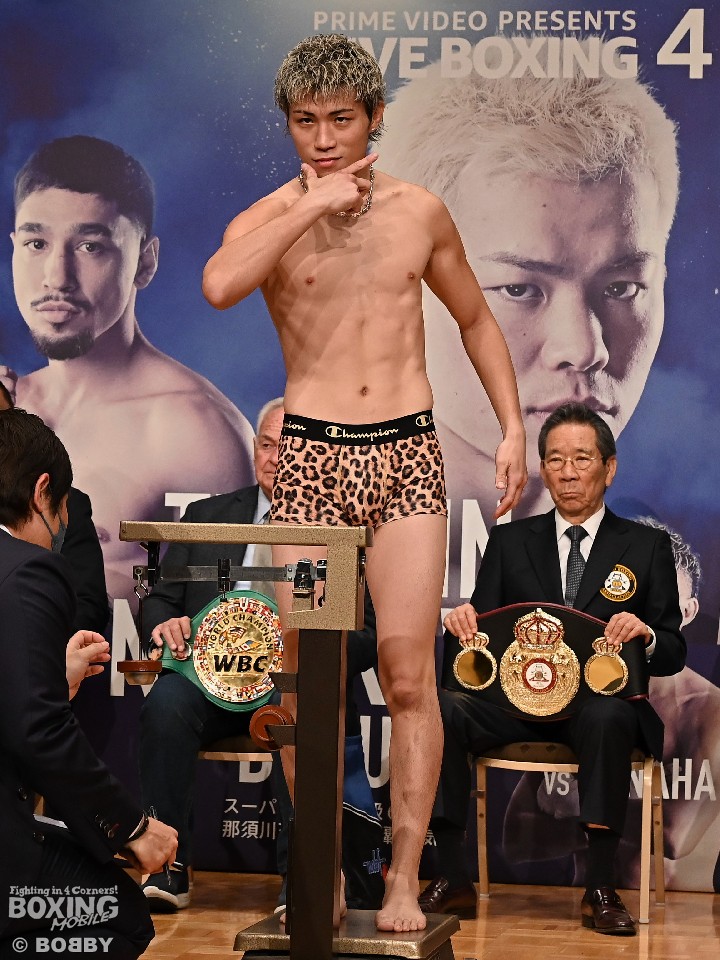 プロボクシングのデビュー戦を迎える元RISE王者の那須川天心(24=帝拳)と日本バンタム級2位の与那覇勇気(31=真正)が7日、都内のホテルに用意された特設会場で、前日計量に臨んだ。