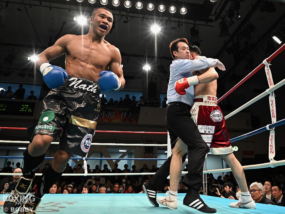 第5試合スーパーウェルター級6回戦では日本ウェルター級15位の辻本純兵(25=帝拳)と日本ミドル級13位のワチュク・ナァツ(22=マーベラス)が対戦。長身の辻本がワンツーで先手を取りにいくが、ナァツは鋭く踏み込んで左右フックをボディに叩きこんだ。すると2回、ナァツの右フックが命中。痛烈なダウンを奪うと連打で試合を終わらせた。