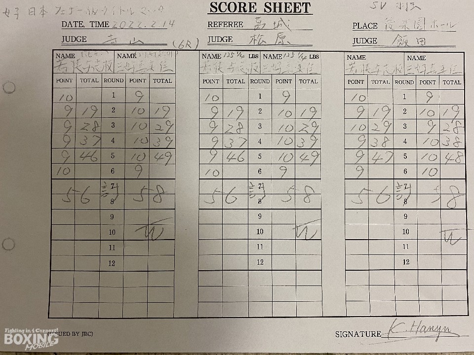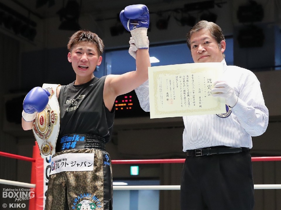 乱打戦を制した三好が雪辱を果たした。序盤はジャブで顔を弾きペースを掌握。3回に若狭はプレスをかけて左右フックで反撃すると三好も真っ向から応戦した。その後は、手数で攻め立てる若狭に対し、三好はワンツーを返し譲らなかった。3者とも2ポイント差で三好が新チャンピオンに輝いた。