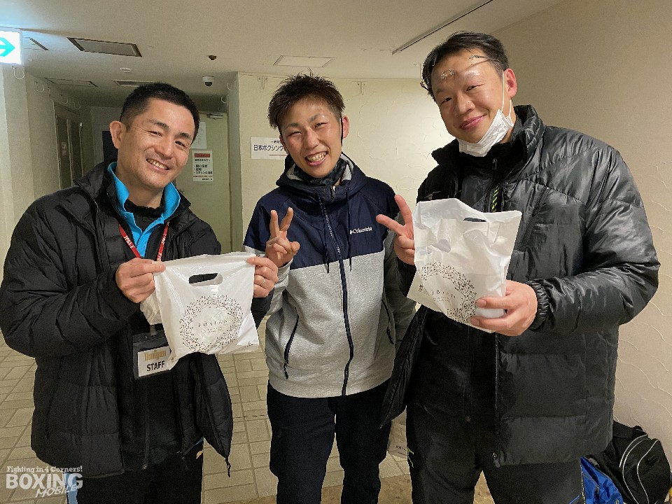 会見後には新田会長とコンビを組む笠康次郎トレーナーにチョコレートをプレゼントした三好。川崎新田ジムにとって最高の夜になった。