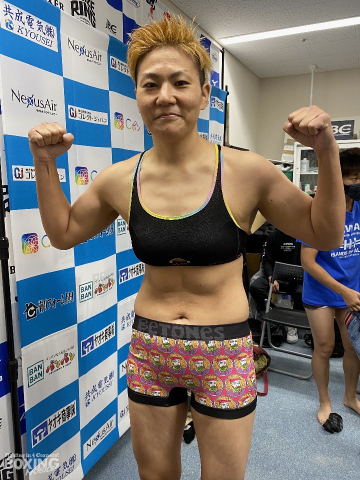一方、王座奪還を狙う若狭は、3試合連続で三好と拳を交える。600gアンダーの56.5sで秤を降りた若狭は「体が大きくなってしまったので」と、2ヶ月半で18s落としたという。しかし、「そこまでキツくなかったですよ」と笑顔を見せて、仕上がりの良さを強調した。