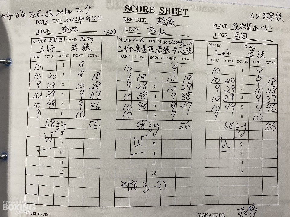 距離を潰してくる若狭に対し、三好はジャブを突きながら右ストレートを好打。中盤、なりふり構わず打ち込む若狭と真っ向から打ち合うと、有効打で上回った。最終6回、若狭は手数を増やして攻め立てたが、最後まで譲らなかった。