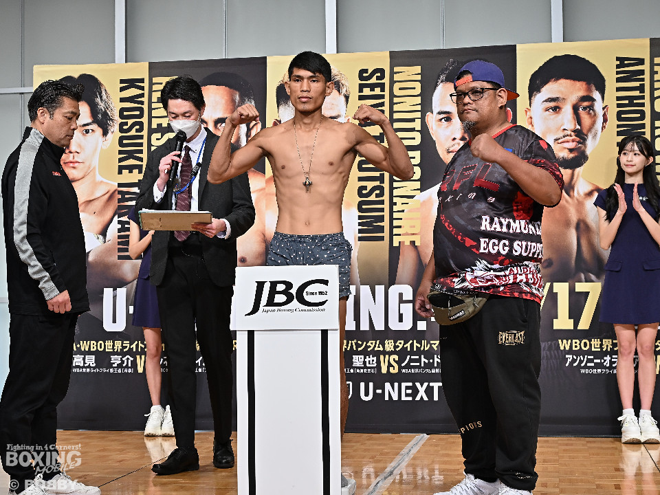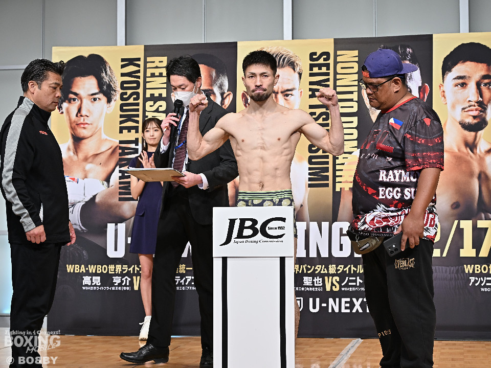 トリプル世界戦で注目を集めている「U-NEXT BOXING 4」が開催される東京・両国国技館のファンが楽しみにしているのが、ユーリ阿久井政悟(30=倉敷守安)の再起戦。51.5kg契約8回戦の前日計量が16日、東京ドームホテルで行われた。ユーリは元WBOオリエンタル・フライ級王者のヴィンセント・ラカール(28=比)と対戦する。