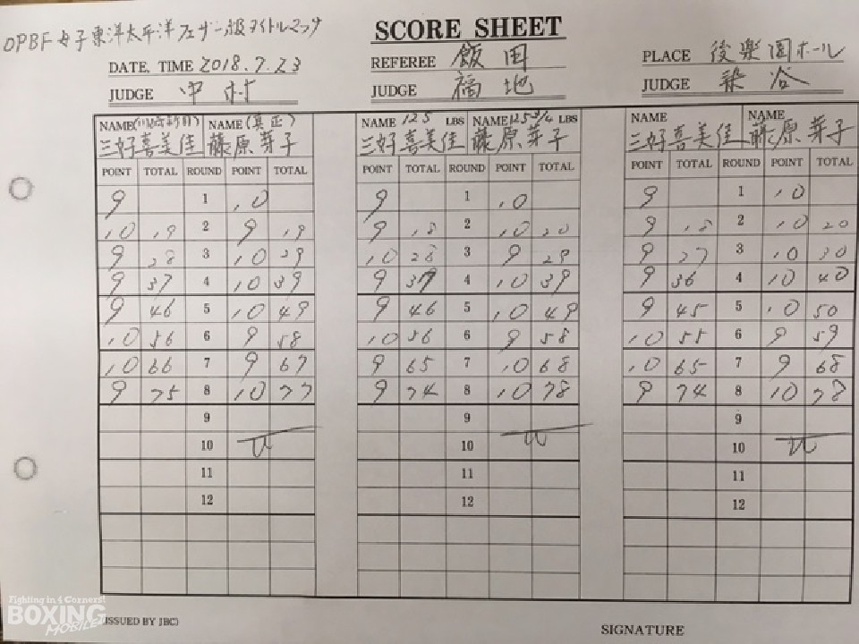 続く回に三好は距離を詰めてワンツーを繰り出し反撃。しかし、藤原は打ち終わりに左フックを好打し見栄えの良いラウンドを作ると、4ラウンド終了時の公開採点は39-37×2、40-36×1でリードした。その後も藤原が有効打を決めてペースを維持した。7回、三好はボディから連打で攻勢を掛け、最終8回は壮絶な打撃戦となったが、藤原の手数が勝り、2〜4ポイント差をつけ新チャンピオンに輝いた。