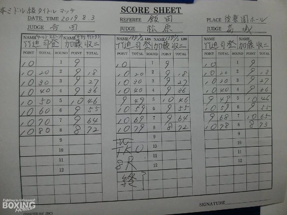 立ち上がりは竹迫が距離を潰して右ボディアッパーから左ボディを叩つけて攻勢。サウスポー加藤はロープを背負い苦しい場面が続いた。その後も竹迫はジャブから組み立てると強弱をつけながら着実にダメージを与えた。劣勢の加藤だったが、5回に右フックでグラつかせると連打を浴びせてダウン寸前まで追い込む。しかし、竹迫もここを踏ん張り強気に打ち返した。前半終了時の公開採点は49-46×2、50-46×1で竹迫がリード。7回も竹迫が上下に打ち分けると、細かいパンチを浴びせるが、加藤は驚異の粘りを見せてと左右のショート連打で会場を沸かせた。8回、竹迫はロープに追い込んでありったけのパンチをぶつけて攻勢。加藤はゴングと同時に崩れ落ちたが、レフェリーはゴング後としてダウンを取らず。しかし、この回のインターバルで加藤陣営が棄権し、試合終了となった。