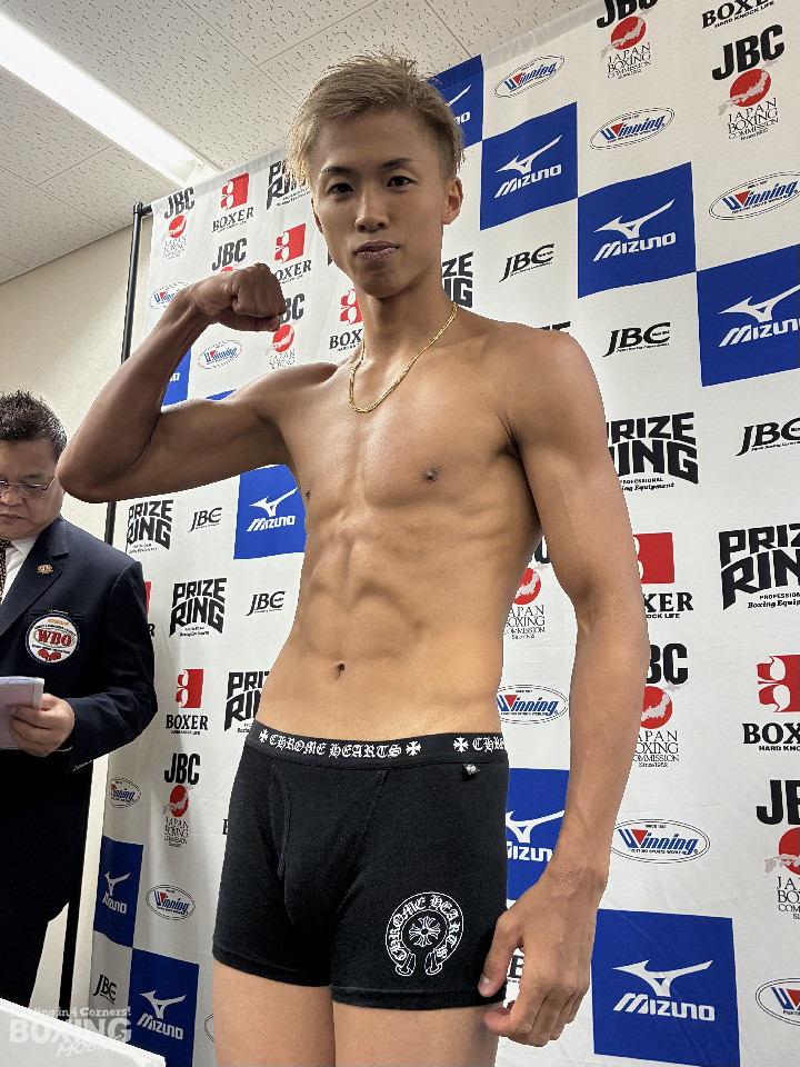 先に秤に乗った豊嶋は、スーパーウェルター級リミットを200g下回る69.6sでパスした。自身8度目のタイトルマッチに向けて、「これまで何度もチャンピオンになっているが、WBOアジアパシフィック王座を獲れば、世界ランキング入りする可能性もある。世界挑戦への切符を手に入れるための試合」と意気込みを語った。