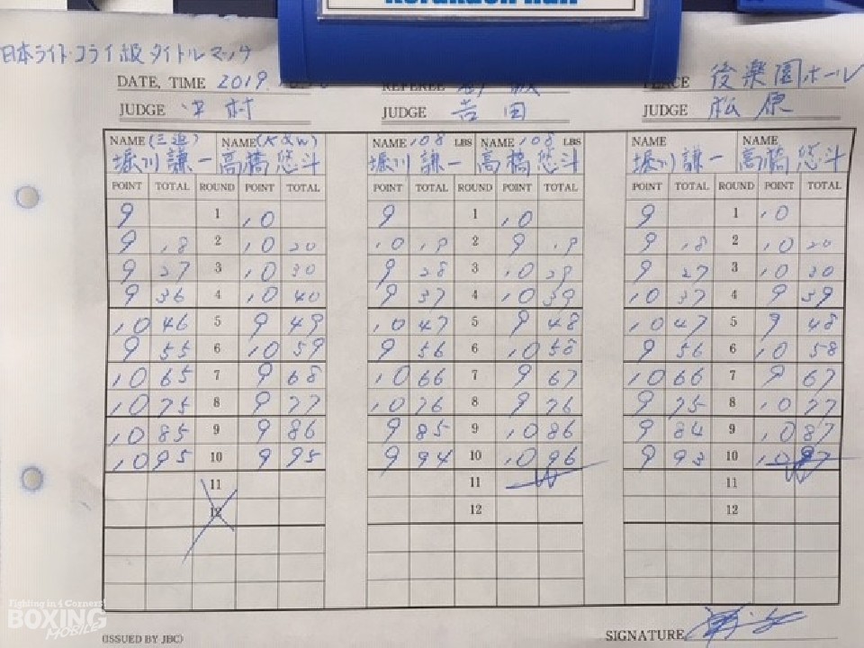立ち上がり、高橋がプレスをかけて右フックをヒット。対する堀川は慌てずにジャブで距離を探った。3回、高橋は距離を詰めて右クロス、左ボディを好打。さらには右ショートアッパーで迎え撃ち攻勢をかけた。5回、堀川は偶然のバッティングで左目上をカット。前半終了時の公開採点は48-47×2、49-46×1で挑戦者がリードした。6回、堀川はワンツーを痛打すると距離を取り見栄えの良さをアピール。続く回も左ボディからワンツーで顔を弾いた。終盤は両者とも一歩も引かず打ち合い譲らなかった。ジャッジに委ねられた採点は1者がドローとしたが、残り2者が高橋を勝ちとし王座が交代した。