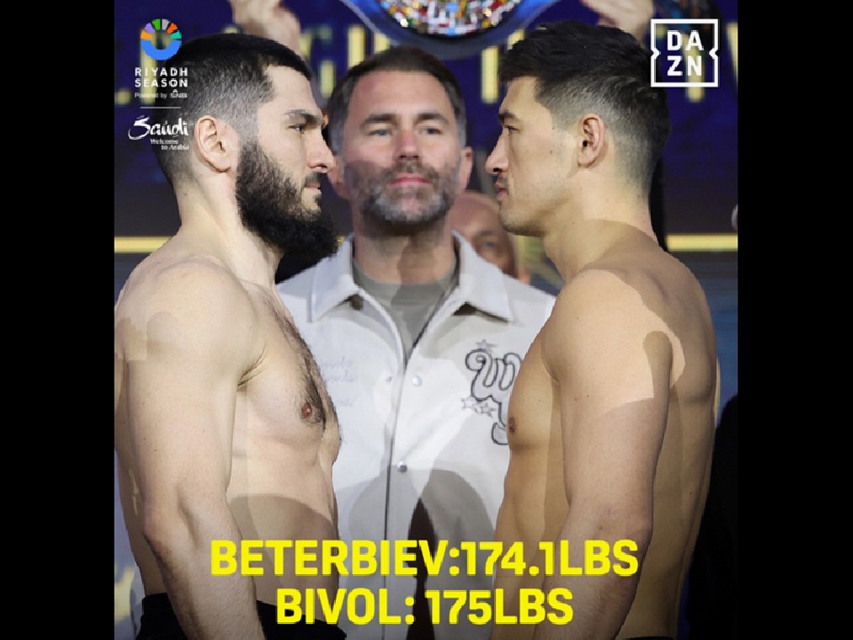 世界ライトヘビー級4冠統一王者アルツール・ベテルビエフ(40=ロシア)と、元WBA世界同級王者ドミトリー・ビボル(34=ロシア)のダイレクトリマッチが日本時間の23日、サウジアラビアのリヤドで決行される。日本時間の22日、現地サウジアラビアで前日計量が行われ、両者が秤の前で対峙した。