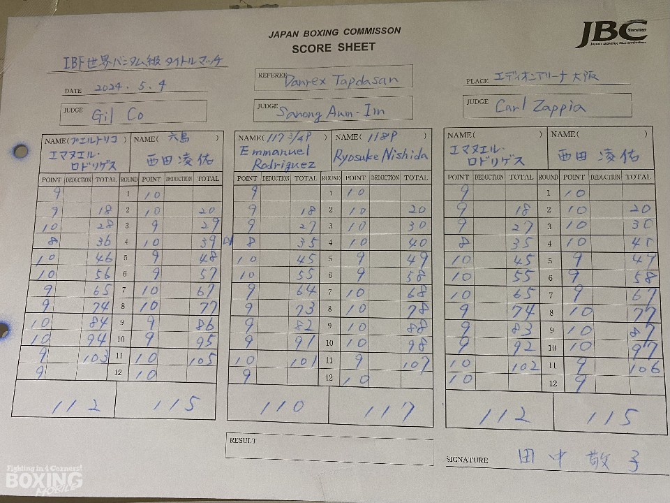 一方、王座を陥落したロドリゲスは、「試合自体には満足している。今夜は彼の方が強かった。判定にも不満はない」と、潔く敗戦を受け入れた。井上尚弥(31=大橋)に奪われて以来、キャリア2度目となるダウンを喫した。「もっと足を使ってくると思った。西田選手が前に出てきたのとパンチに耐えたのは想定外。ボディは本当に効いた。ダウンした時はパニックになったが、立て直すことができたが…」と言うと、「メキシコでずっとキャンプを張っていたので、プエルトリコに帰ってゆっくりしたい。階級を上げることも考えている 」と今後に関して語った。
