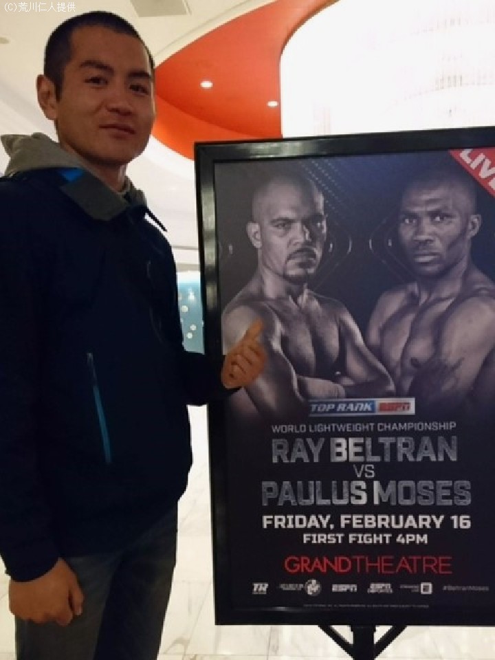 WBOアジアパシフィック・ライト級王者の荒川仁人(36=ワタナベ)が16日(日本時間17日)、米国ネバダ州リノのグランド・シエラ・リゾート&カジノで行われるWBO(世界ボクシング機構)ライト級王座決定戦、同級1位のレイムンド・ベルトラン(36=メキシコ/米)対同級2位のパウルス・モーゼス(39=ナミビア)戦を観戦するために米国入り。試合会場の雰囲気を味わっているところに前日計量を終えたベルトランと遭遇した。するとベルトランが