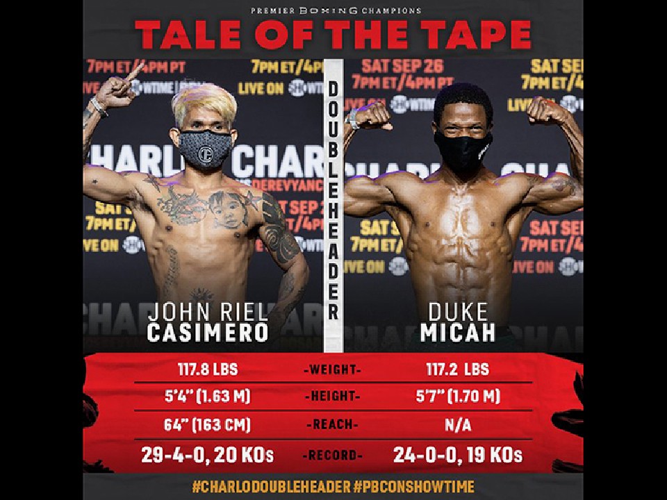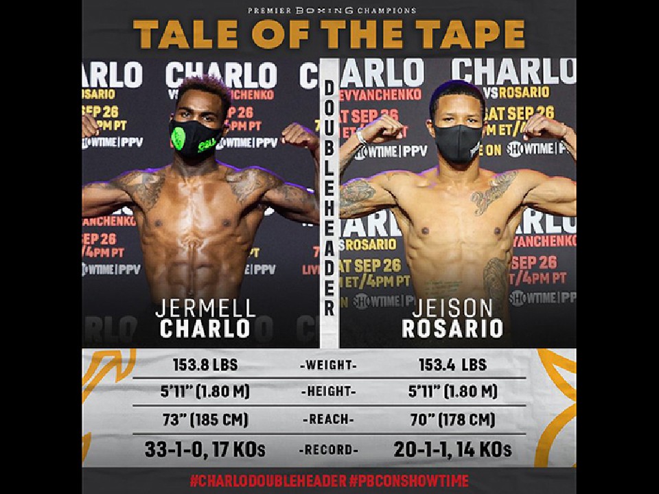 この日のメインイベントとなるPPV2部で最後に登場するスーパーウェルター級3冠統一戦。同級リミット69.8kgをWBC王者ジャメール・チャーロは100gアンダーの69.7kgでパス。対するWBAスーパー、IBF王者ジェイソン・ロザリオ(25=ドミニカ共和国)は300g軽い69.5kgで合格した。