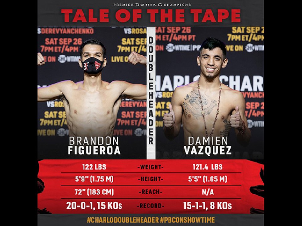 WBAスーパーバンタム級正規タイトルマッチは1部のセミ格としてセットされ、王者ブランドン・フィゲロア(23=米)が同級リミット55.3kgでクリア。挑戦者同級14位ダミアン バスケス(23=米)は300g少ない55.0kgで合格した。