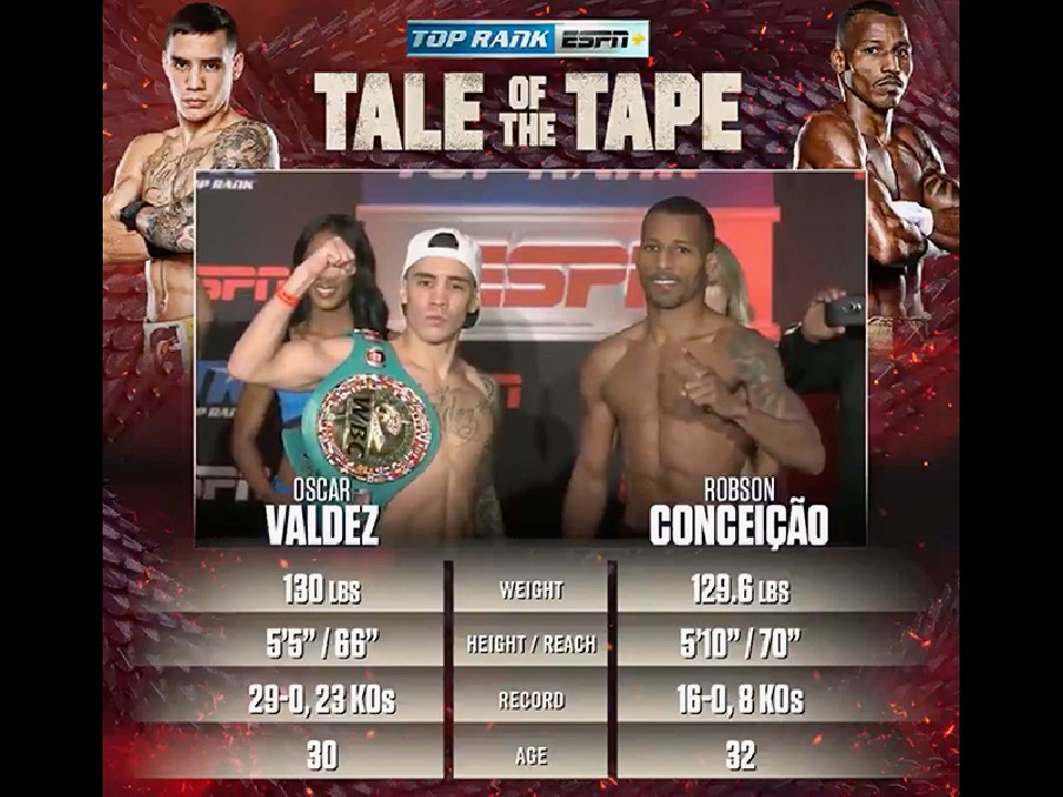 メインイベントではWBC(世界ボクシング評議会)スーパーフェザー級王者オスカル・バルデス(30=メキシコ)が同級15位のロブソン・コンセイソン(32=ブラジル)を迎えてV1戦を決行する。両者は9日の前日計量で秤の前で対峙した。