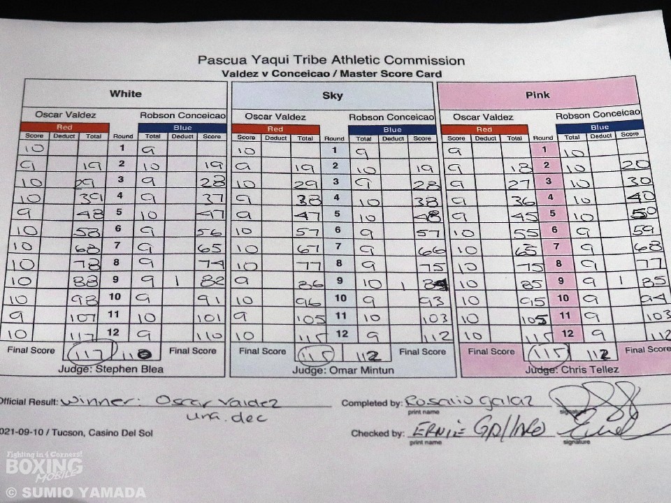 この試合は、ジャッジ3名のうち2名が115-112でバルデスを支持し、ブレア氏は117-110でバルデスの勝ちと判定した。
