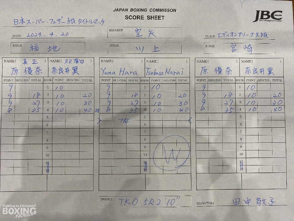開始から左を差し合う中、奈良井がスピードを活かしてタイミングを掴んだ。ジャブを飛ばす原だが、2回、3回と奈良井が右クロスを好打。4回にはここぞのタイミングで左フックを合わせて、ダウンを奪った。勝負が決まったのは5回。プレスをかける原に対し、奈良井はジャブでじっくりと様子を見ると、ワンツーを叩き込んで2度目の尻もちをつかせると、右ストレートで再び倒してレフェリーストップを呼び込んだ。地元でベルトを奪った奈良井は、リング上で歓喜の涙を流した。