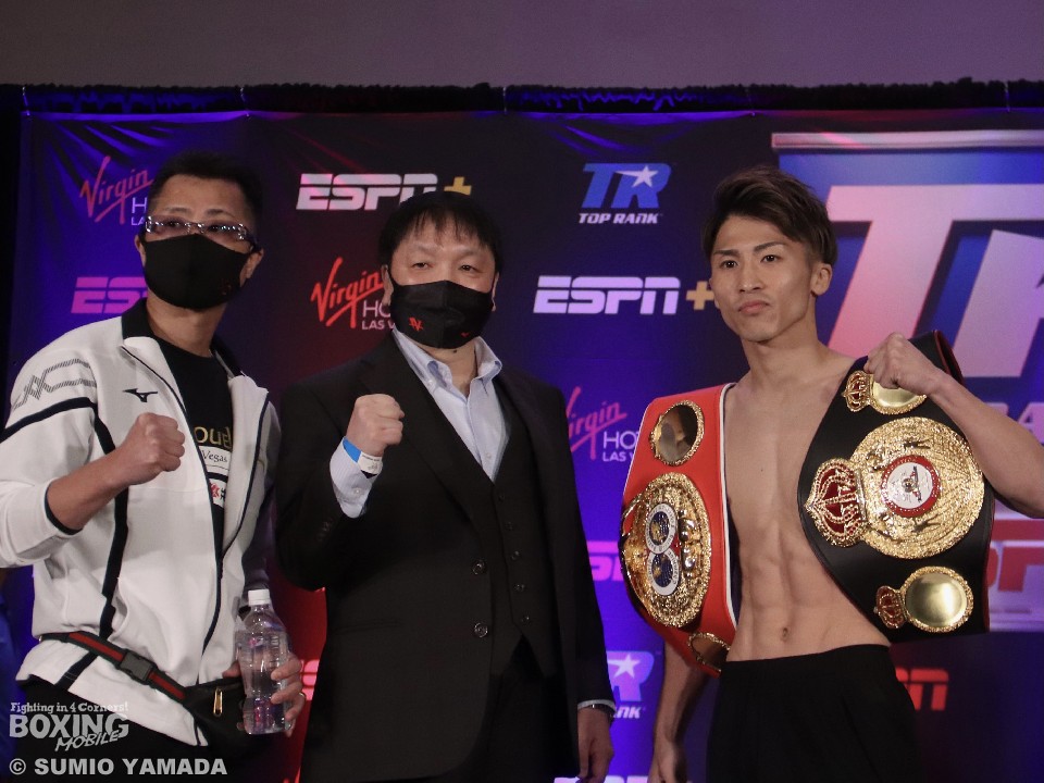 井上はリミットちょうどの53.5s、挑戦者でIBF同級1位、WBA同級8位のマイケル・ダスマリナス(28=比)は300gアンダーの53.2sで一発でクリアした。計量後は控室で水分補給をすると徐々に笑顔が戻ってきた。