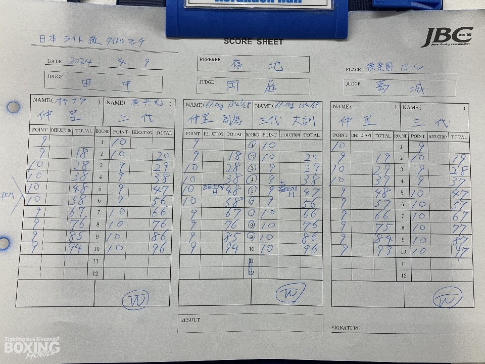 三代がジャブを丁寧に突きながら組み立てるのに対し、仲里はプレスをかけて右を返した。一進一退の攻防が続いた。前半終了時の公開採点は、48-47×3で仲里がリード。7回、三代は前後の動きを意識しながら、ジャブを軸にポイントを加点。仲里は正面から浴びてしまう。三代は集中力を切らさず、打たれてもすぐに押し返してペースを譲らず。7〜10回は、すべてポイントを奪った。