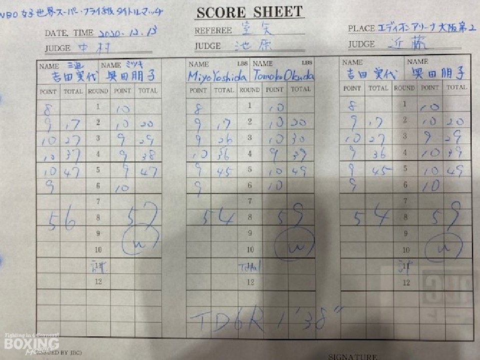 WBO(世界ボクシング機構)女子スーパーフライ級タイトルマッチが13日、エディオンアリーナ大阪(大阪府立体育会館第2競技場)で開催された「強拳ステージ.17」のメインイベントで行われ、王者の吉田実代(32=三迫)と挑戦者で日本&OPBF東洋太平洋女子バンタム級王者の奥田朋子(37=ミツキ)が拳を交えた。