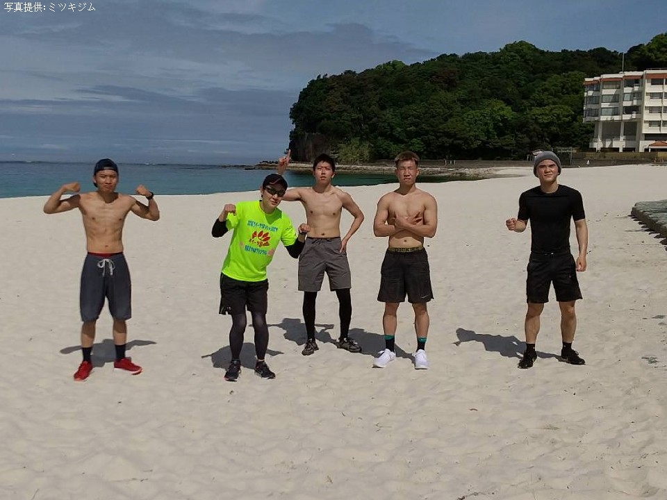 午前は、山道と砂浜を約1時間かけてのランニングとラダートレーニング。午後は、ロングダッシュとショートダッシュで心拍数を上げるトレーニングを2時間。さらに夕方から白浜町内にあるジムでジムワークとハードメニューを消化する。
