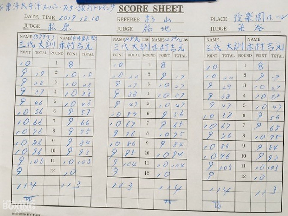 三代が右フックをテンプルに決めて先制のダウンをゲット。しかしタイトル奪取に闘志を燃やす木村は4回に左フックでグラつかせ反撃した。4ラウンド終了時の公開採点は38-37×2(三代)、38-37×1(木村)と割れた。その後は三代は試合運びの上手さを見せてポイントを稼ぐと8回終了時に76-75×3とリード。後半は気迫あふれるファイトで迫る木村に対し、三代は真っ向から打ち合い譲らなかった。ジャッジは割れたが三代を支持し、ベルトを死守した。