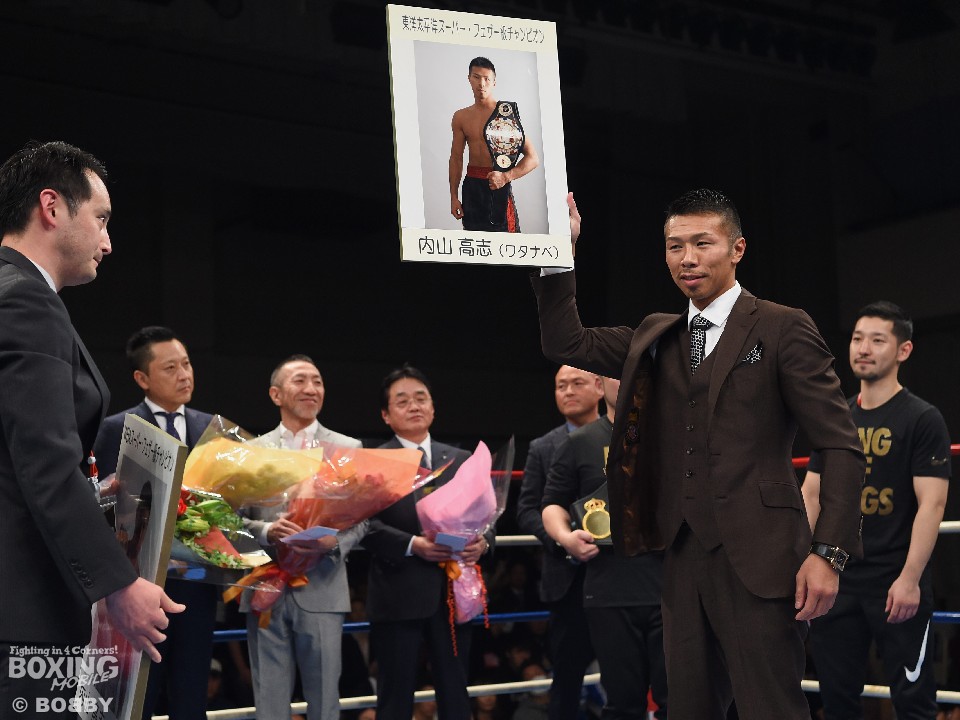 慣れ親しんだ須藤尚紀アナウンサーのリングコールで入場した内山は、観客の声援に応え右手を高らかに上げリングイン。日本ボクシングコミッション、日本プロボクシング協会から記念品が、さらに後援会から花束と松坂牛一年分、高級スーツ一式、さらに自宅リフォーム権が贈呈され、華やかなセレモニーとなった。