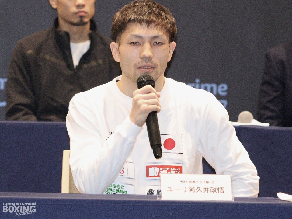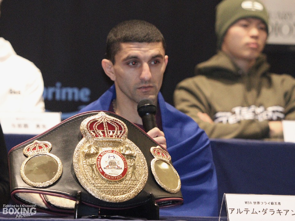 WBA(世界ボクシング協会)フライ級タイトルマッチの記者会見が21日、大阪市内のホテルで行われ、王者のアルテム・ダラキアン(36=ウクライナ)と同級1位のユーリ阿久井政悟(28=倉敷守安)が意気込みを語った。
