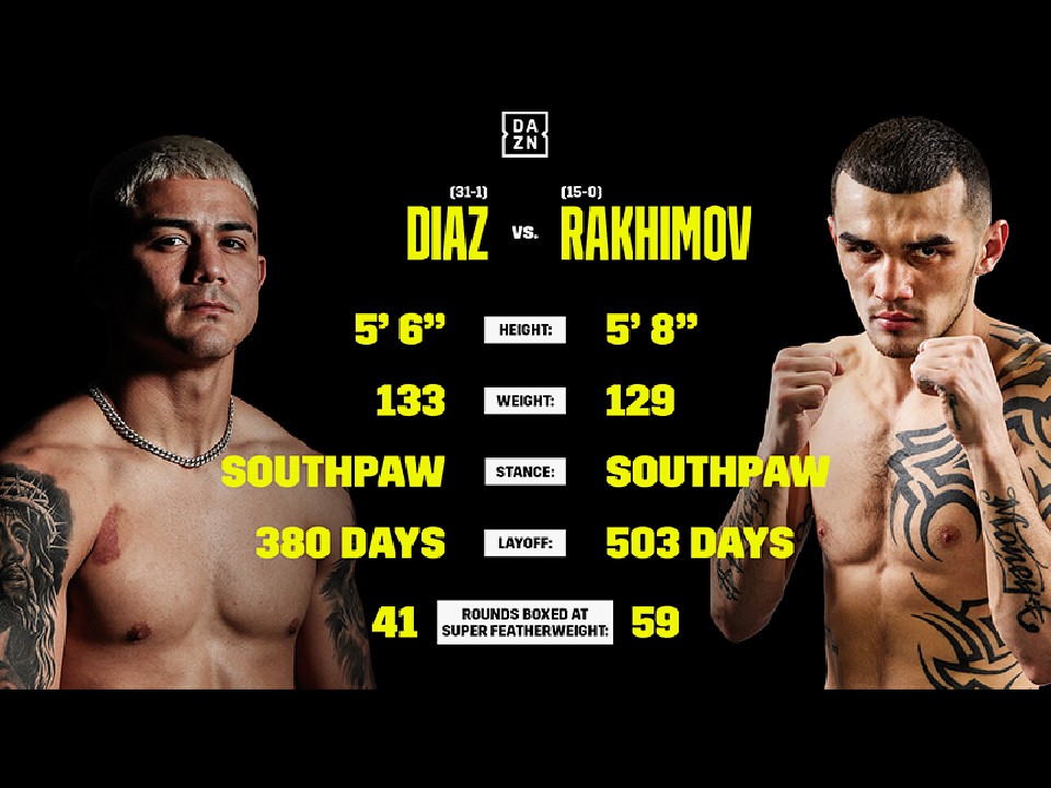 2度目となる体重超過により王座を剥奪されているディアスの戦績は33戦31勝(15KO)1敗1分。全勝記録が途絶えたラヒモフは6戦15勝(12KO)1分とした。