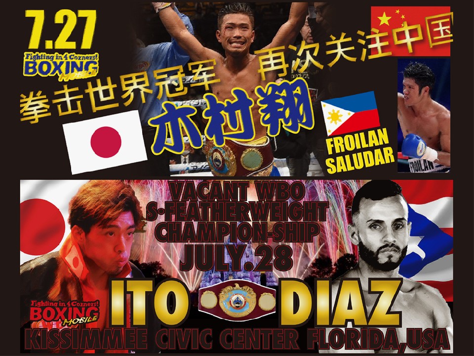 また、今週末の海外は2人の日本人選手が登場、7月27日、中国・青島市にてWBO(世界ボクシング機構)フライ級タイトルマッチ、王者の木村翔(29=青木)が同級3位のフローイラン・サルダール(29=フィリピン)相手に2度目の防衛を行い、28日(日本時間29日)には米国・フロリダ州・キシミーで行われるWBOスーパーフェザー級2位の伊藤雅雪(27=伴流)が同級1位クリストファー・ディアス(23=プエルトリコ)のWBO世界Sフェザー級王座決定戦だ。共に勝利して再び日本にベルトと共に帰ってくる事を心より願う。