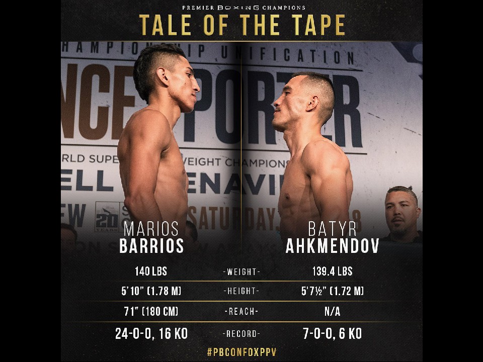 WBA世界スーパーライト級正規王座決定戦は、バリオスが同級リミットの63.5kgで合格。アホメドは400g少ない63.1kgで秤を下りた。スーパー王座には現在WBSS(ワールド・ボクシング・スーパー・シリーズ)の決勝を控えるレギス・プログレイス(米)が君臨。暫定王者兼1位としてアルベルト・プエロ(ドミニカ)、ゴールド王者にはイヴ・ユリスJr(カナダ)がいる中でのレギュラー王座決定戦となる。