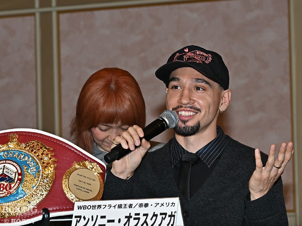 2度目の防衛戦に臨むオラスクアガは、「体調も良好で、万全に仕上がった。京口選手は2階級制覇している強い相手。たくさんのパンチが交錯する試合になる」と激戦を予感させると、「もちろん勝利しか考えていない。エキサイティングな試合をして、WBOの指輪をもらえるよう防衛を続けていく」と笑顔を交えながら、意気込みを語った。
