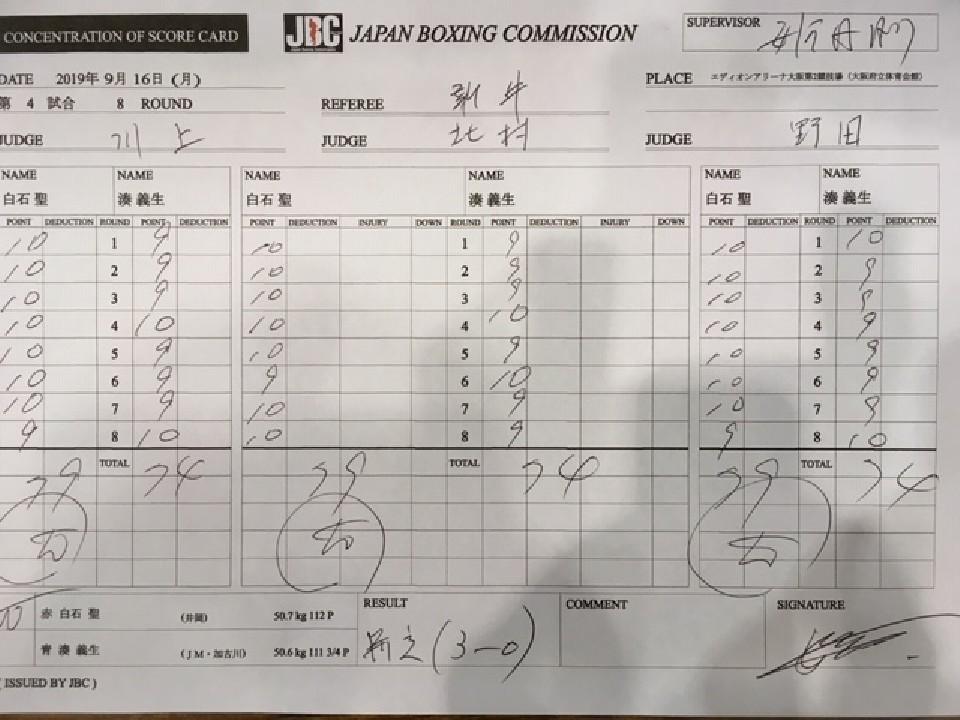 距離を制した白石がベルトを手に入れた。白石は序盤から左を軸にプレッシャーをかけてワンツーをヒット。主導権を握ると、中盤はボディ攻撃でポイントを連取した。その後も白石が出入りのボクシングでペースを維持、最終8回は湊の反撃にあったが、決定打を打たせず、ジャッジ3者の支持を得た。