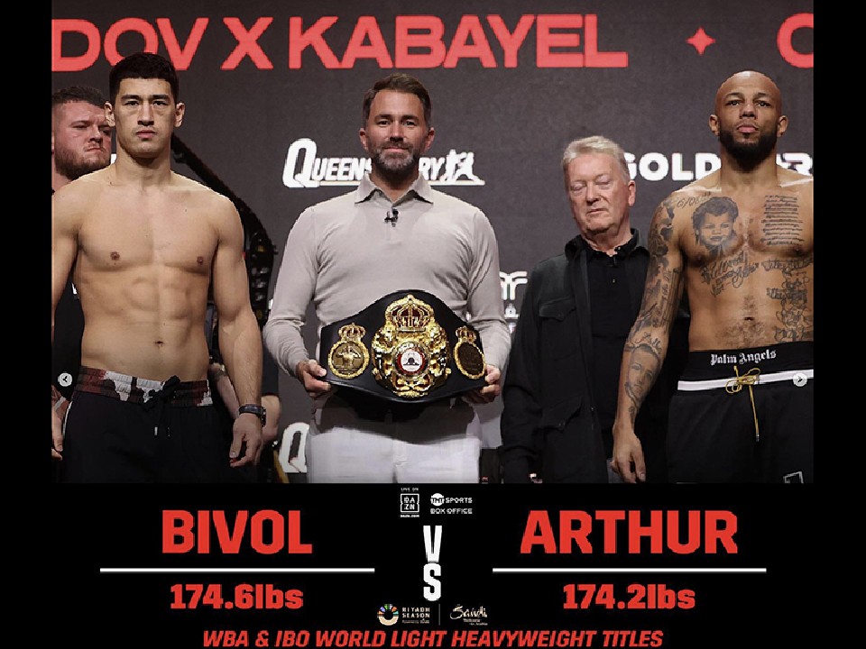 サウジアラビアの首都リヤドのキングダム・アリーナで23日(日本時間24日)に開催されるビッグイベント「Day of Reckoning(最後の審判)」のアンダーカードには、WBA(世界ボクシング協会)ライトヘビー級タイトルマッチも組まれた。現地時間の22日、王者デミトリー・ビボル(33=ロシア)と、WBA同級8位のリンドン・アーサー(32=英)が前日計量を迎えた。