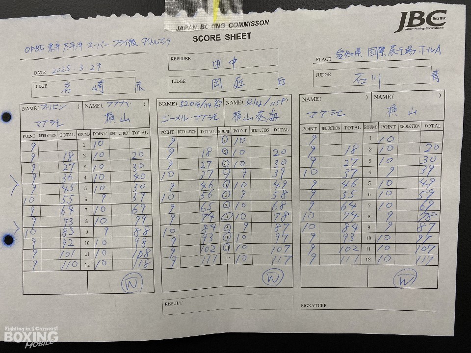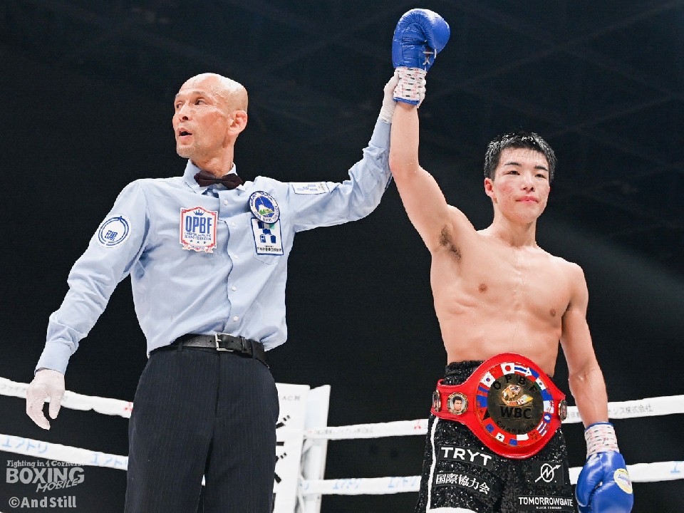 ジャブの差し合いから火蓋を切った、OPBF東洋太平洋スーパーフライ級の一戦、横山が距離を掴むと、左を上下に散らし試合を掌握。2度目の公開採点でも、横山のポイントリードは変わらず。しかし、9回からマグラモがプレスを強めて猛追。ここを耐えた横山は、11回に左ボディを起点に一気に流れを引き戻した。最終回、リズムを掴んだ横山の有効打が勝る中で試合終了。大差判定勝ちで、横山が国内男子最速タイ記録となる3戦目でOPBF王座を獲得した。