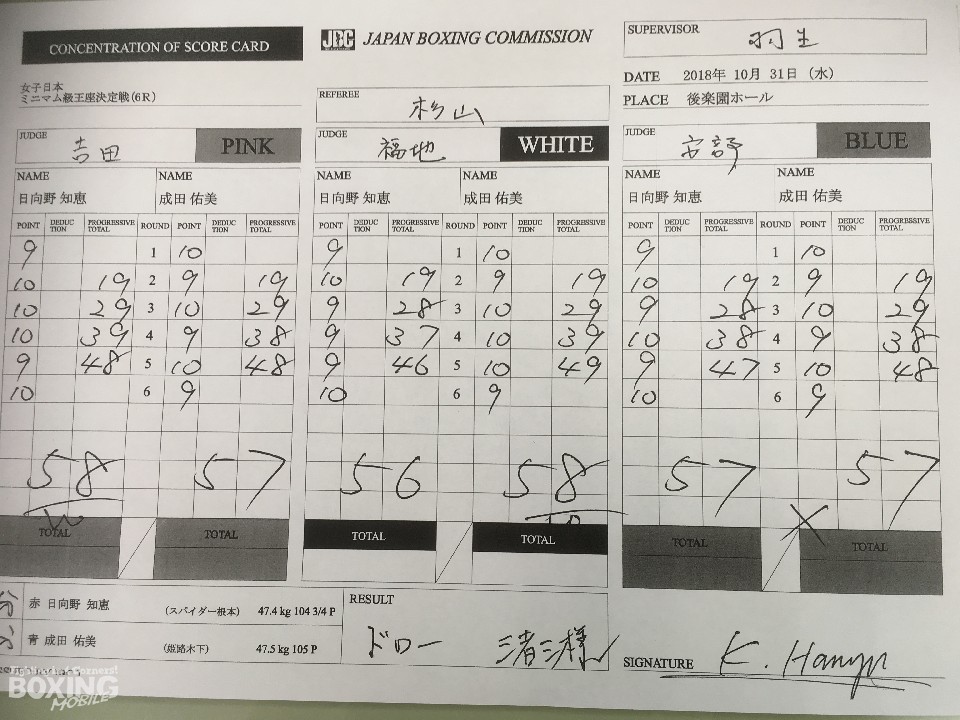 成田がジャブから組み立てると右ストレートを決めて日向野の出鼻を挫いた。流れを変えたい日向野は3回にプレスをかけて打撃戦に持ち込むと成田もこれに応戦。中盤は激しいパンチの交換となり一進一退の攻防に。終盤は日向野が手数を増やして反撃すると、成田も押し負けず試合終了のゴングを聞いた。ジャッジに委ねられた採点は三者三様の引き分けとなり、王座は空位のままとなった。