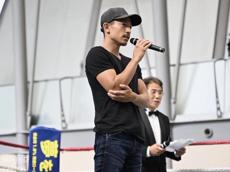 LUSH緑ジムから大橋ジムに移籍した力石は「苦渋の決断で、名古屋から横浜に行った力石です。先に兄が試合をやるので、そっちの応援を全力でよろしくお願いします。僕は普通に勝つので。兄の応援をよろしくお願いします」と、地元愛知のファンに矢吹のサポートを願った。