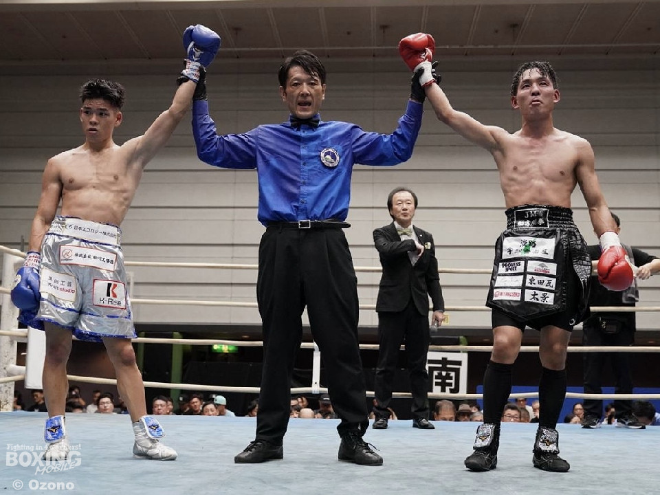 サウスポー小田切が中間距離をキープしながら、リズム感のある攻撃で見栄えの良さをアピール。リターンの左ストレートを決めると、クリンチで攻撃を遮断した。中盤から終盤にかけて、湊はプレスをかけてワンツーで反撃。さらに回転力を活かした連打で猛追した。ジャッジ1者は小田切につけたが、残り2者は引き分けで決着はつかなかった。