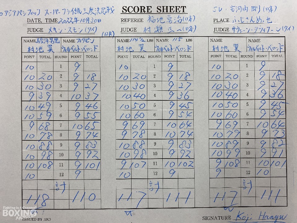 村地が見事なパフォーマンスを見せた。序盤から左を軸にペースを掌握。ベロンドの右ロングフックを距離で外すと、左ボディを痛打した。中盤、右オーバーハンドを浴びてヒヤリとさせたが、足を使いながらメリハリのある攻撃で主導権を渡さず。何度もロープに詰めて、連打で攻勢をかけた。大差の判定勝ちで、村地が新王者に就いた。