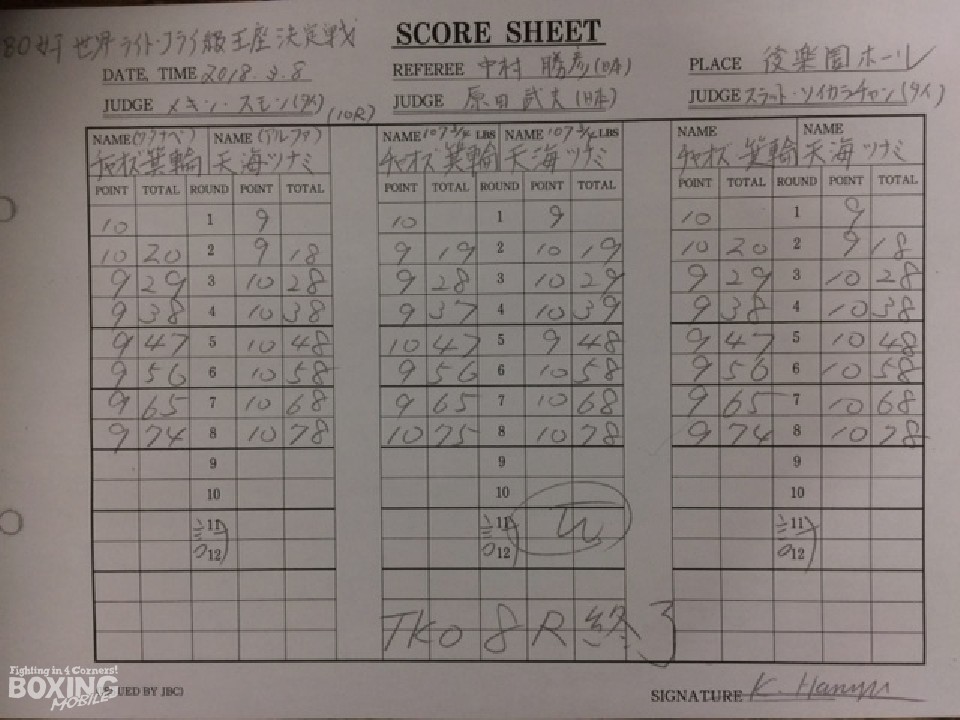 試合は箕輪が機動力を発揮し先手で攻め込み、天海が左右に体を振りながら右をかぶせる形でスタート。序盤は押せ押せの箕輪だったが、5回にヒッティングで左目上をカットすると打ち合いに引かなかった天海に流れが傾き、ジャブ、ワンツーが箕輪の顔面を捉え続けた。すると8回が終わったところで箕輪陣営が棄権を申し出て試合終了。天海が世界王座に返り咲くと同時に、2階級制覇を達成した。