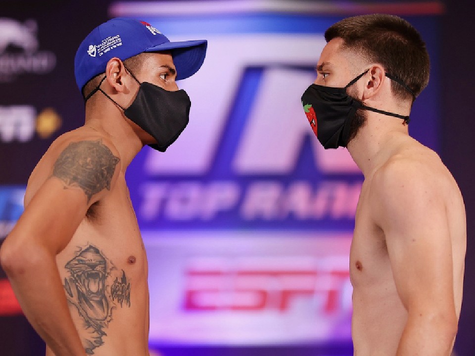 ナバレッテはアンダーウェアを脱いでフェザー級リミット57.1kgでパス。ビラは500gアンダーの56.6kgで秤を降りた。