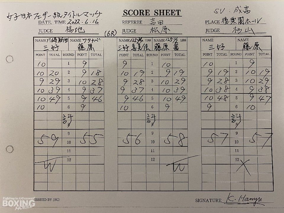 ジャッジの好みが大きく分かれる形となった。序盤から三好がジャブを飛ばしながらプレスをかければ、藤原はガードを固めて、打ち終わりに単発の左フックをヒット。中盤は上下のコンビネーションで攻め立てる三好に対し、藤原も真っ向から応戦し譲らず。最後までお互いの意地がぶつかり合った。採点は三者三様の引き分けで、三好が初防衛に成功した。