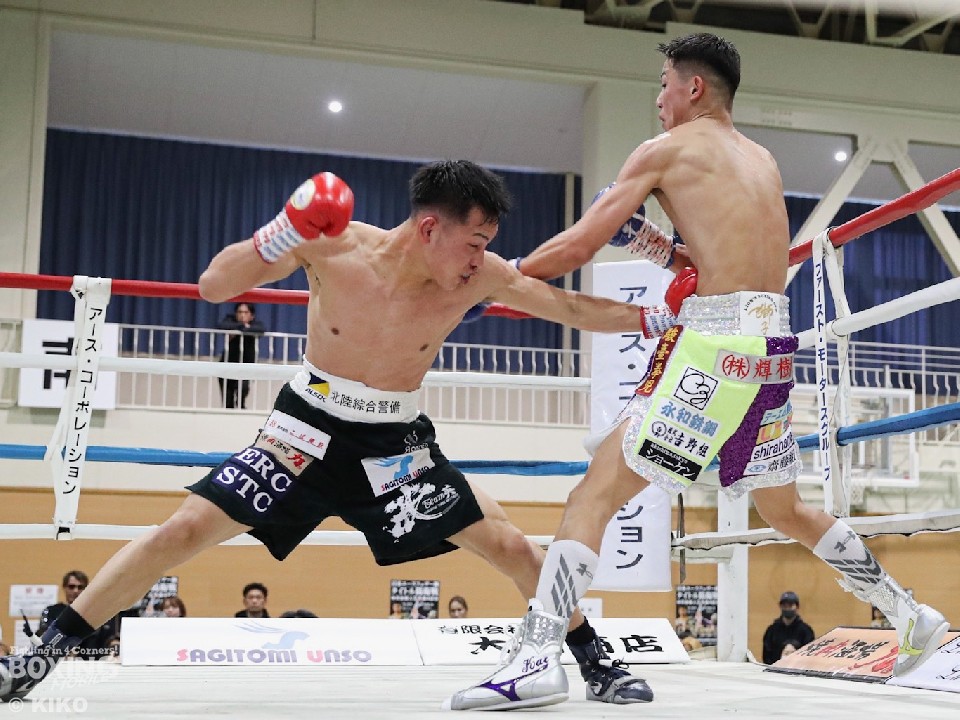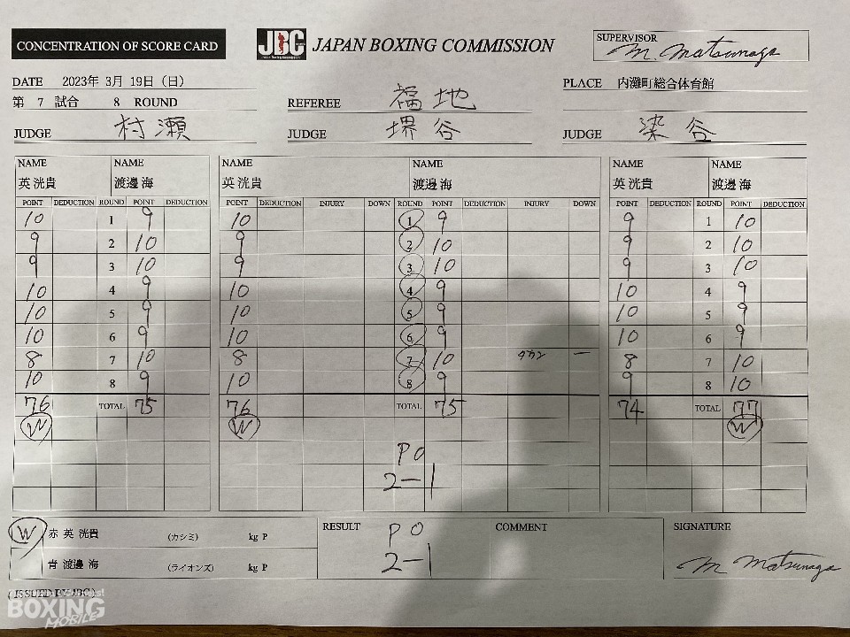 開始から英が距離を潰して、先制攻撃。渡邊は3回に左フックで膝を揺らしたが、続く4回は英が右ストレートでバランスを崩させて譲らず。中盤は、英がプレスをかけてアグレッシブな姿勢を見せた。7回、渡邊が右カウンターでダウンを演出。英はゴングに救われた。大歓声が沸き起こる中、最終8回は両者とも必死にパンチを繰り出した。ジャッジ2者の支持を得た英が勝利した。