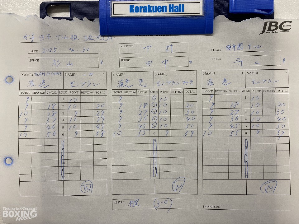 初回、モンブランがワンツーを好打すると、ボディにパンチを集めて先手を奪うことに成功。2回以降、ショートレンジでの打ち合いとなるが、モンブランは右ストレートを決めて、ポイントを加点。最終6回、渡邉は回転力を活かした連打で攻め立てたが、モンブランも最後まで手数を出した。終始、有効打を集めたモンブランが新チャンピオンに輝いた。