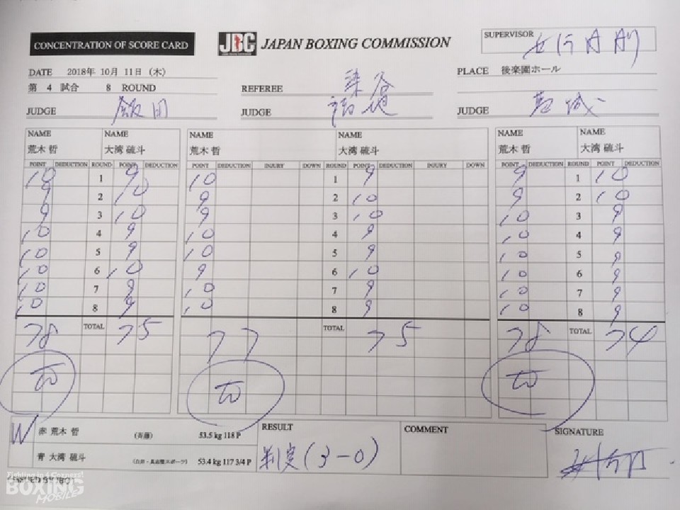 後楽園ホール初登場の荒木が足を使いジャブから右につなげるのに対し、大湾は右ストレート、右アッパーで対抗。距離を詰めたい大湾だが相手の懐の深さにペースを握れず。終盤は、荒木が接近戦から左ボディ、左右アッパーを当てて見栄えの良さをアピールすると、ジャッジに委ねられた採点は関西のホープに軍配が上がった。