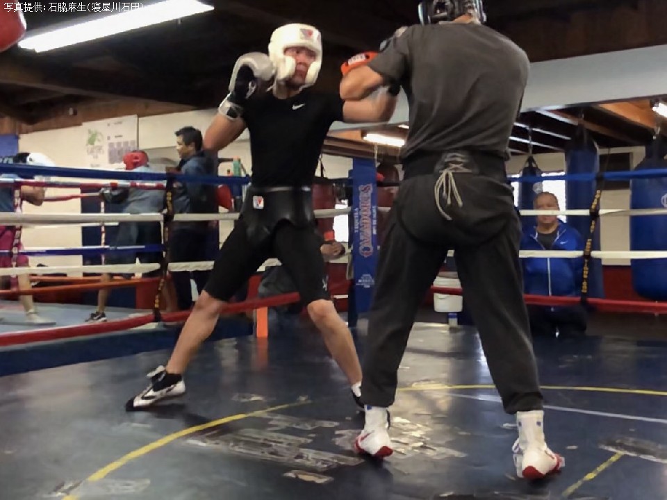 練習初日、石脇はロサンゼルス郊外のメイウッドジムで、メキシカンボクサーとのスパーリングを敢行。石脇によれば、「パンチの軌道が見えず、やりにくさを感じました。こちらはミット打ちなどはあまりせず、スパーリングが中心の練習になるようです。週の4日はスパーリング、残り2日はボクシングの動きに必要なフィジカル練習です。こちらの選手は生まれつきではなく、日頃のトレーニングの違いでパンチの強さがあるのだと思いました」と、本場のボクシングを肌で感じている。基本的に朝から海岸線をランニング、その後、午前中にジムでスパーリングを行うスケジュールだ。