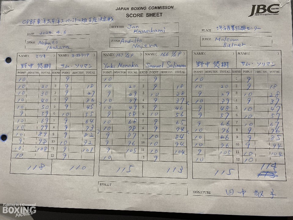 序盤はサウスポー野中が、ジャブを上下に散らしながら組み立てると、4回には左オーバーハンドをヒット。4回終了時の公開採点で39-37×2、40-36とリードした野中は、中盤も左ストレートを決めて、ポイントをピックアップした。終盤、ソリマンは頭から突っ込みながら、右フックを軸に積極的な攻撃。最終12回、野中は左ボディストレートで動きを止めて山場を作った。野中が判定勝ちで新チャンピオンに輝いた。