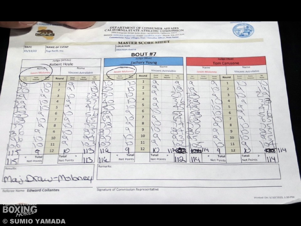 判定に持ち越された注目のWBOバンタム級新チャンピオン誕生の瞬間、モロニーもアストロラビオも勝利を強く願ったが、2-0でモロニーが勝ち名乗りを受けた。