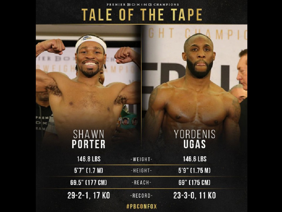 ウェルター級リミットの66.6kgを挑戦者ウガスは200g軽い66.4kgで合格するも、ポーターは最初の秤で800gオーバーとなる67.4kgを記録。しかし、残された再計量までの時間内で体重を落とし、ブレイドのヘアスタイルの一部切って再び秤に上がると66.59kgとギリギリ10gアンダーでパス。安堵からポーター陣営は喜びを爆発させると、チェックに来ていたウガス陣営のイスマエル・サラス・トレーナー達と喜びの握手を交わした。