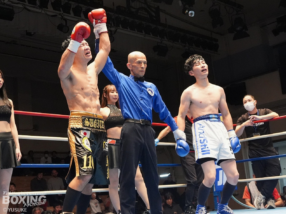 秋間が変則的なジャブを飛ばすのに対し、杉田はジャブを突きながら丁寧なボクシングを展開。この日の杉田は攻め急がず、ブロックで相手の決定打を外すなど、メリハリのある攻撃を見せた。中盤、秋間は手数を増やして反撃に転じたが、杉田はジャブを軸に、ブレないボクシングで最後までペースを渡さなかった。採点は割れたが、杉田を支持。杉田が日本ランカーを撃破した。